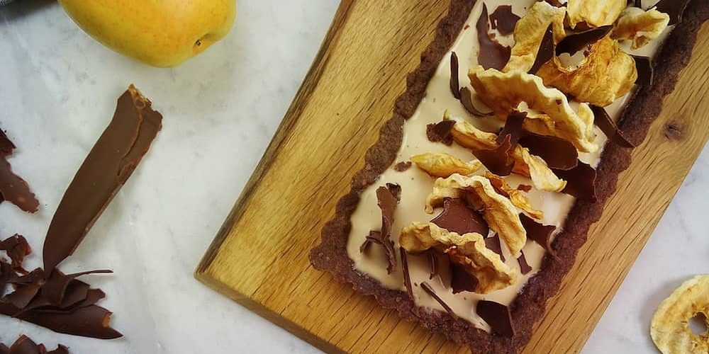 Togliere la crostata dal frigo e guardine con le chips di mela. Schiacciare il cilindro di carta da forno e rompere lo stato di cioccolato ricavando delle scaglie. Distribuire sulla crostata. Ora è pronta per essere servita!